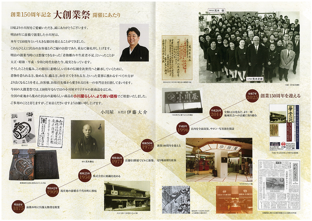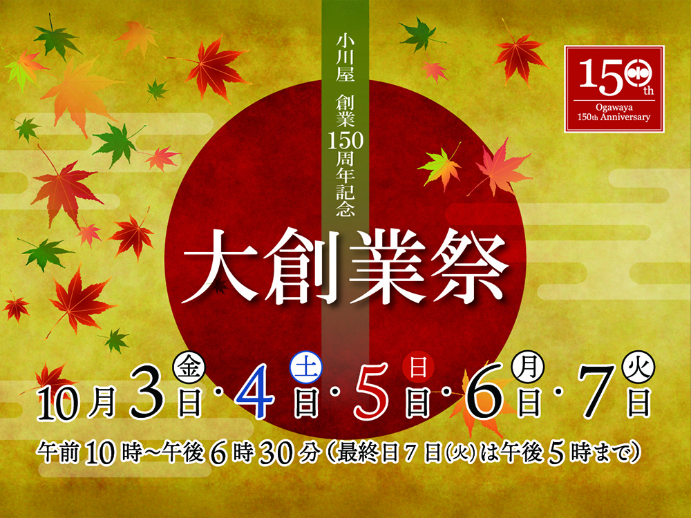 皆様に支えられ、小川屋は創業150周年を迎えることができました。日頃の感謝を込めて、特別な品々を取り揃えた「大創業祭」を開催いたします。皆様のお越しを心よりお待ちしております。