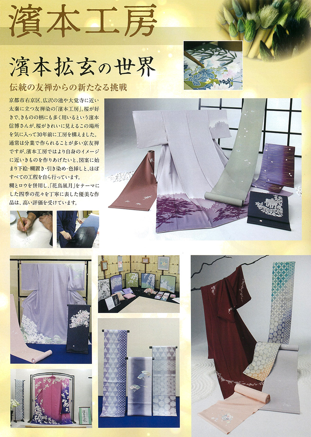 分業制で知られる京友禅の世界で、自身のイメージをカタチにするため図案からほぼすべての工程をひとりでこなす濱本拡玄氏。花鳥風月をテーマにした優美で奥深い作品の数々をご覧ください。