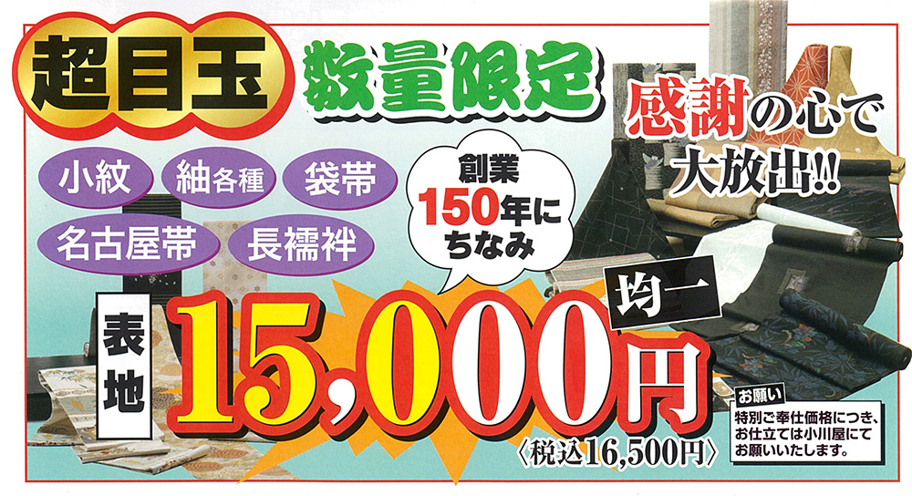 創業150周年にちなみ、小紋、紬、各種袋帯、名古屋帯、長襦袢を、なんと均一15,000円(税込16,500円)でご用意。早い者勝ちです!