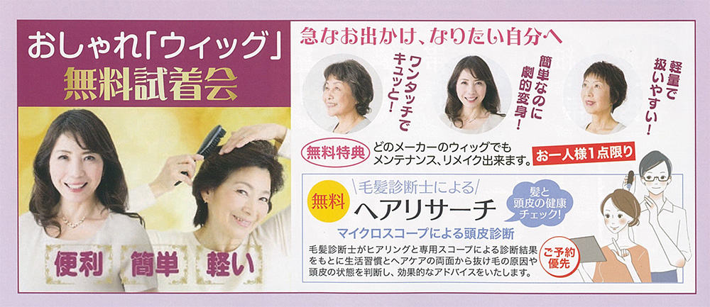 急なお出かけにも、簡単・便利でおしゃれなウィッグはいかがですか。ウィッグアドバイザーによる試着のほか、無料のヘアリサーチ(頭皮・毛髪診断)も実施します。