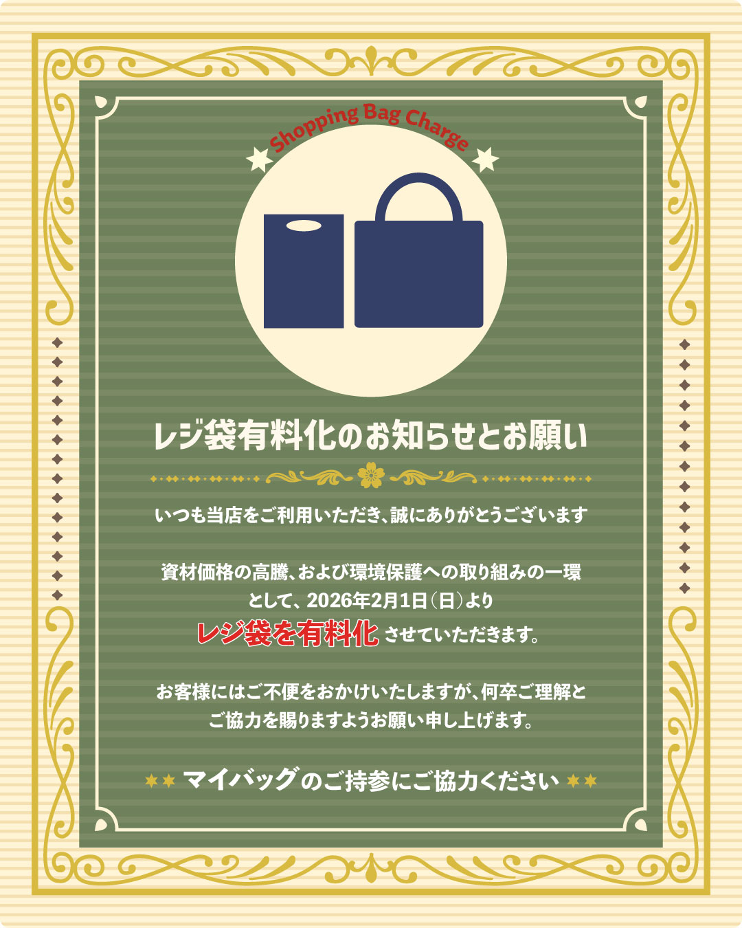 この度、当店では資材価格の高騰、および環境保護への取り組みの一環として、2026年2月1日(日)よりレジ袋(ショッピングバッグ)を有料化させていただくこととなりました。